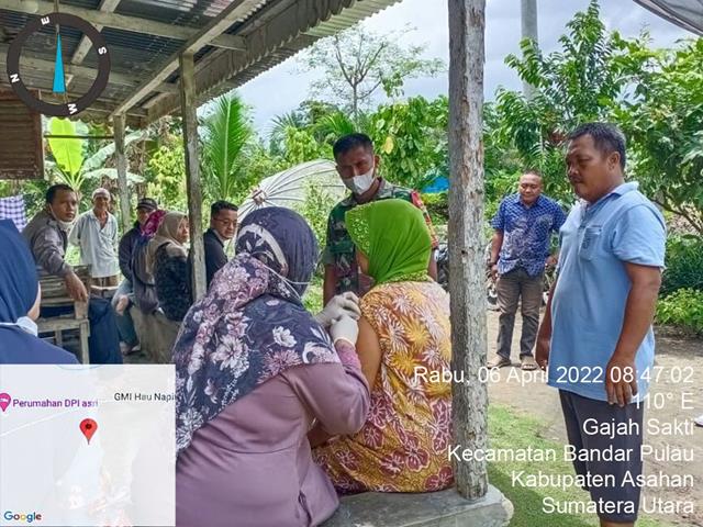 Asahan  | Dalam rangka mendukung kegiatan Serbuan Vaksinasi dan memutus mata rantai penularan Covid-19, dalam hal ini seperti yang dilakukan oleh Personel BIntara Pembina Desa (Babinsa) Koramil 15/Bandar Pulau jajaran Kodim 0208/Asahan Kopda Sutopo turun kewilayah desa binaan untuk melaksanakan pendampingan paksin secara dortudor rumah kerumah masnyarakat serta memberikan memahaman pentingnya pemberian paksin ini di lakukan agar kita semua terhindar dari wabah virus korona sehingga kita semua sehat dalam pelaksanaan penyambupatan hari raya idulfitri bersama dengan Brigadir Tumanggor (Anggota Polsek Bandar Pulo), Bapak Sulaiman (Anggota Kecamatan Bandar Pulo), Para tenaga kesehatan Puskesmas Gonting Malaha dan Masnyarakat yang hadir, kegiatan tersebut yang dilaksanakan bertempat di Dusun Empat Desa Gajah Sakti Kecamatan Bandar Pulo Kabupaten Asahan, Rabu (06/04/2022).