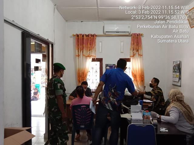 Asahan  |  Dalam rangka mendukung kegiatan Serbuan Vaksinasi dan memutus penularan Covid-19, seperti halnya yang dilakukan oleh Personel Bintara Pembina Desa (Babinsa) Koramil 12/Air Batu jajaran Kodim 0208/Asahan Serma Rahmad turun kewilayah binaan untuk melaksanakan kegiatan pendampingan serbuan vaksinasi DOSIS I dan II Sinovac, Pfizer dan Astra Zeneca untuk warga desa binaan, kegiatan tersebut yang dilaksanakan bertempat di Aula Balai Desa Pinanggripan Dusun I Kecamatan Air Batu Kabupaten Asahan, Kamis (03/02/2022).