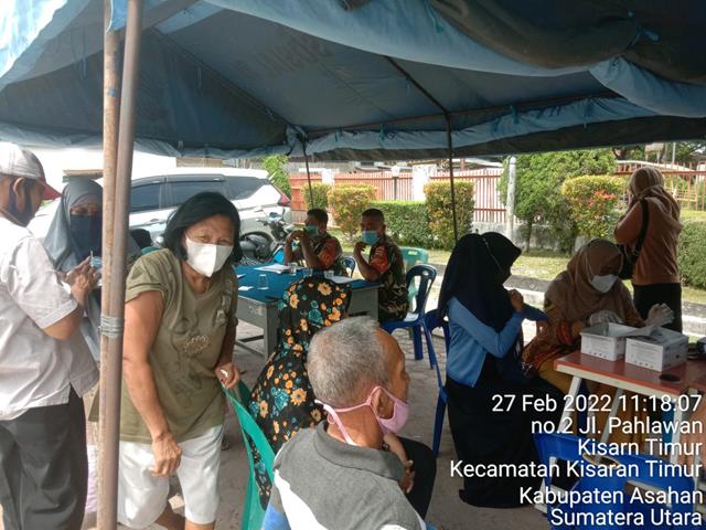 Asahan  |  kegiatan pendampingan vaksinasi Covid-19 adalah salah satu bentuk dukungan terhadap program pemerintah sebagai upaya keluar dari pandemi Covid-19,Mari kita dukung program vaksinasi demi meningkatkan kekebalan daya tahan tubuh warga terhadap serangan Covid-19, seperti halnya yang dilakukan oleh Personel Bintara Pembina Desa (Babinsa) Koramil 06/Kisaran jajaran Kodim 0208/Asahan Serka Syafriman turun kewilayah binaan untuk turut serta melaksanakan kegiatan pendampingan Vaksinasi kepada Masyarakat warga binaan, kegiatan tersebut yang dilaksanakan bertempat di Kantor Lurah Jalan Budi Utomo Lingkungan 1 Kelurahan Siumbut Umbut Kecamatan Kisaran Timur Kabupaten Asahan, Minggu (27/02/2022).