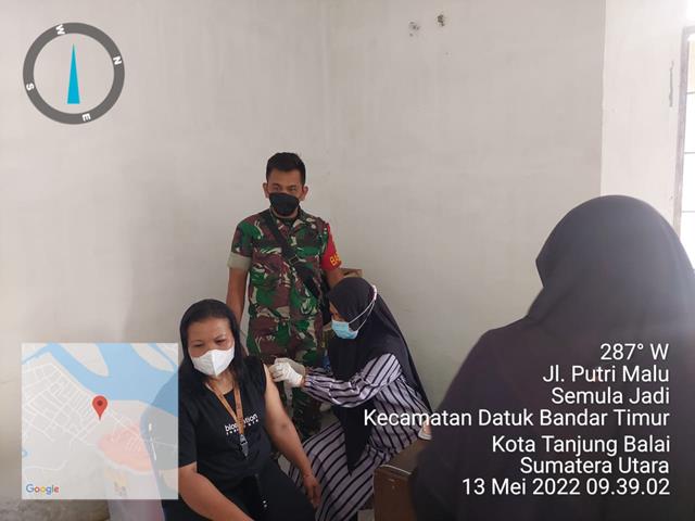 Tanjung Balai | Dalam rangka kegiatan pendampingan vaksinasi Covid-19 adalah salah satu bentuk dukungan terhadap program pemerintah sebagai upaya keluar dari pandemi Covid-19, mari kita dukung program vaksinasi demi meningkatkan kekebalan daya tahan tubuh warga terhadap serangan Covid-19, seperti halnya yang dilakukan oleh Personel Bintara Pembina Desa (Babinsa) Koramil 17/Datuk Bandar jajaran Kodim 0208/Asahan Kopda Agus Nuriaddin turun kewilayah binaan untuk turut serta melaksanakan kegiatan pendampingan serbuan Vaksinasi kepada warga Masyarakat desa binaan bersama dengan Bhabinkamtibmas Datuk Bandar Timur dan Nakes 10 orang, kegiatan tersebut yang dilaksanakan bertempat di Puskesmas Semulajadi Jalan Putri Malu Lingkungan VIII Kelurahan Semulajadi Kecamatan Datuk Bandar Timur Kota Tanjung Balai, Jumat (13/05/2022).