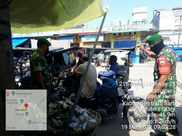 Batu Bara  |  Dalam rangka untuk menghindari klaster haru Wabah Virus Corona atau Covid-19, dalam hal ini Personel Bintara Pembina Desa (Babinsa) Koramil 02/Air Putih jajaran Kodim 0208/Asahan Peltu Budi. S dan Serda Indra turun kewilayah binaan untuk melaksanakan Pam Disiplin Mandiri Covid-19 di Pasar Delima Indrapura dengan menghimbau kepada para pedagang dan pembeli agar selalu mencuci tangan dgn sabun, menggunakan masker dan menjaga jarak serta menghindari kerumunan guna mencegah penularan Covid-19, kegiatan tersebut yang dilaksanakan beralamat di Pasar Delima Kelurahan Indrapura Kecamatan Air Putih Kabupaten Batu Bara, Kamis (19/05/2022).