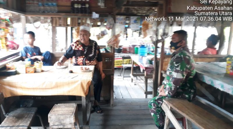 Asahan | Agar terjalinnya hubungan yang harmonis antara masyarakat Desa Sei Kepayang Kira dengan Babinsa Koramil 10/SK dalam rangka menegakkan disiplin Protokol Kesehatan (Prokes), dalam kesempatan ini Personel Bintara Pembina Desa (Babinsa) Koramil 10/Sei Kepayang jajaran Kodim 0208/Asahan Serda Dedy Surya turun kewilayah binaan untuk melaksanakan kegiatan Komunikasi Sosial (Komsos) dan Penegakan Disiplin Protokol Kesehatan dengan menghimbau warga agar setiap beraktifitas keluar rumah supaya senantiasa menggunakan masker, menjaga jarak dan sesering mungkin mencuci tangan guna mencegah penyebaran penularan virus Covid-19, kegiatan tersebut yang dilaksanakan bertempat di Jalan Tanjung Balai-Tanjung Ledong Desa Sei Kepayang Kiri Kecamatan Sei Kepayang Barat Kabupaten Asahan, Jumat (26/11/2021).