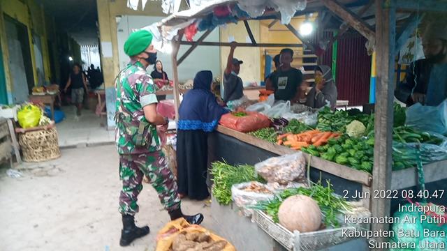 Batu Bara | Dengan adanya himbauan dari para Babinsa, para pedagang dan pembeli merasa senang dengan adanya himbauan dari Babinsa, dalam hal ini Personel Bintara Pembina Desa (Babinsa) Koramil 02/Air Putih jajaran Kodim 0208/Asahan Serda Hendra S dan Serda Wardoyo turun kewilayah binaan untuk melaksanakan kegiatan Pam Disiplin Mandiri Covid-19 di Pasar Delima Indrapura dengan menghimbau kepada para pedagang dan pembeli agar selalu mencuci tangan dgn sabun, menggunakan masker dan menjaga jarak serta menghindari kerumunan guna mencegah penularan Covid-19, kegiatan tersebut yang dilaksanakan bertempat di Pasar Delima Kelurahan Indrapura Kecamatan Air Putih Kabupaten Batu Bara, Kamis (02/06/2022).