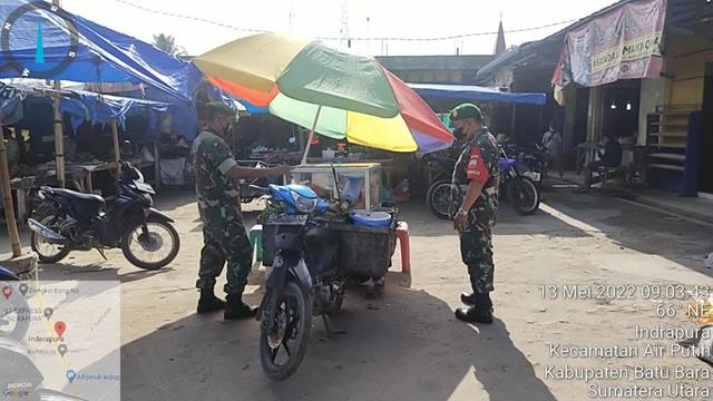 Batu Bara | Dalam rangka untuk menghindari klaster haru Wabah Virus Corona atau Covid-19, dalam hal ini Personel Bintara Pembina Desa (Babinsa) Koramil 02/Air Putih jajaran Kodim 0208/Asahan Pelda Sunardy dan Serda A. Rozak turun kewilayah binaan untuk melaksanakan Pam Disiplin Mandiri Covid-19 di Pasar Delima Indrapura dengan menghimbau kepada para pedagang dan pembeli agar selalu mencuci tangan dgn sabun, menggunakan masker dan menjaga jarak serta menghindari kerumunan guna mencegah penularan Covid-19, kegiatan tersebut yang dilaksanakan beralamat di Pasar Delima Kelurahan Indrapura Kecamatan Air Putih Kabupaten Batu Bara, Jumat (13/05/2022).