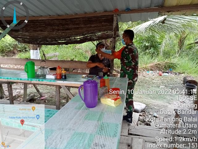 Tanjung Balai  |  Guna untuk memutus mata rantai penyebaran Virus Covid 19 di wilayah Binaan, sehubungan dengan merebaknya penyebaran wabah virus Corona (Covid-19) di Indonesia, dan sebagai upaya peningkatan kewaspadaan serta pencegahan meluasnya wabah COVID-19. Guna untuk memutus mata rantai penyebaran Virus Covid 19 di wilayah Binaan, Personel Bintara Pembina Desa Koramil 17/Datuk Bandar jajaran Kodim 0208/Asahan Kopka Ja Simanungkalit turun langsung kewilayah binaan untuk melaksanakan pengawasan protokol covid-19 kepada masyarakat dengan memberikan pemahaman New Normal yaitu menggunakan masker setiap keluar rumah, cuci tangan pakai sabun, menjaga jarak dan membagikan masker bersama dengan Bapak Saparuddin dan Bapak Marlan, kegiatan tersebut yang dilaksanakan bertempat di Warung Kopi Ani Jalan M.H. Thamrin Kelurahan Pahang Kecamatan Datuk Bandar Kota Tanjung Balai, Senin (10/01/2022).