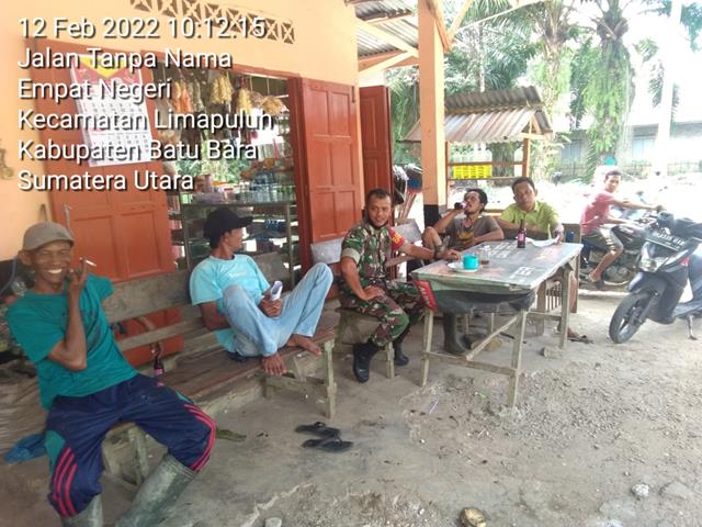 Batu Bara | Agar terjalinnya hubungan yang harmonis antara masyarakat desa binaan dengan Babinsa guna mendukung Tugas Pokok sebagai seorang Babinsa serta terwujudnya Kemanunggalan TNI dengan Rakyat, seperti halnya yang dilakukan oleh Personel Bintara Pembina Desa (Babinsa) Koramil 03/Lima Puluh jajaran Kodim 0208/Asahan Serka Mulyadi turun kewilayah binaan untuk melaksanakan kegiatan Komunikasi Sosial (Komsos) bersama dengan Tokoh masyarakat dan masyarakat desa, memberikan semangat dan ajakan agar tokoh masyarakat agar selalu berperan aktif dalam membina warganya terutama remaja agar ikut aktif dalam menjaga ketertiban dan keamanan desa, karena dusun 1 daerah perlintasan antar desa tetangga sehingga rawan terjadi kegiatan kejahatan, kegiatan ini dilakukan bersama dengan Tokoh Pemuda Bapak Amat dan Masyarakat Desa Empat Negeri serta menghimbau agar selalu mematuhi protokol kesehatan dan tentang pelaksanaan Vaksin, kegiatan tersebut yang dilaksanakan bertempat di Dusun 1 Desa Empat Negeri Kecamatan Lima Puluh Kabupaten Batu Bara, Sabtu (12/02/2022).