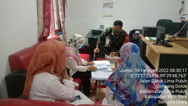 Batu Bara | Agar terjalinnya hubungan yang harmonis antara masyarakat desa Sei Kepayang Tengah dengan Babinsa guna mendukung Tugas Pokok sebagai seorang Babinsa serta terwujudnya Kemanunggalan TNI dengan Rakyat, seperti halnya yang dilakukan oleh Personel Bintara Pembina Desa (Babinsa) Koramil 03/Lima Puluh jajaran Kodim 0208/Asahan Serka Hijar Windro turun kewilayah binaan untuk melaksanakan kegiatan Komunikasi Sosial (Komsos) bersama Sekdes Bapak Jefri dan kaur Desa Simpang Dolok serta warga binaan dengan menghimbau agar selalu mematuhi protokol kesehatan dan tentang pelaksanaan Vaksin serta membahas tentang pendataan warga serta rekapan pencapaian vaksinasi, guna mengetahui sudah berapa banyak persentase warga yang sudah tervaksin guna menekan perkembangan virus Corona Covid 19, kegiatan tersebut yang dilaksanakan bertempat di Desa Simpang Dolok Kecamatan Datuk Lima Puluh Kabupaten Batu Bara, Jumat (18/02/2022).