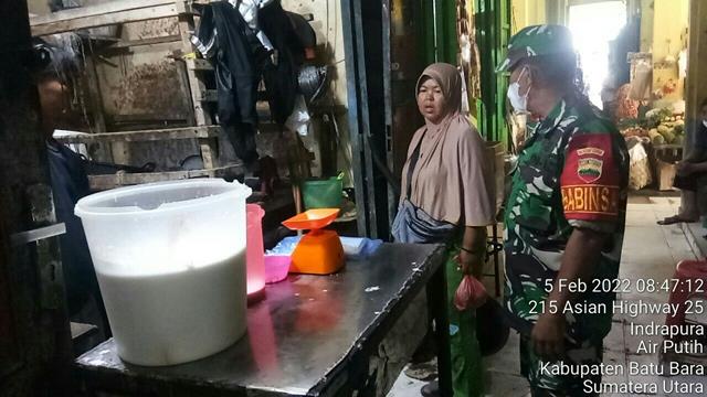 Batu Bara  |  Para pengunjung atau konsumen merasa senang dengan adanya himbauan Babinsa karena selalu di ingatkan untuk mematuhi prokes guna memutus penyebaran Virus Covid 19, dalam hal ini Personel Bintara Pembina Desa (Babinsa) Koramil 02/Air Putih jajaran Kodim 0208/Asahan Serda Anwar Sadat dan Serda Supardi turun kewilayah binaan untuk turut serta melaksanakan kegiatan patroli disiplin mandiri covid 19 dipasar delima indrapura menghimbau kepada pedagang dan pembeli agar tetap menggunakan masker dan menjaga jarak serta tidak lupa mencuci tangan guna memutuskan penyebaran covid 19 dengan menghimbau kepada para pedagang dan konsumen serta para pengunjung sgar selalu menggunakan masker, mencuci tangan dan menjaga jarak guna menghindari penularan Covid-19, kegiatan tersebut yang dilaksanakan bertempat di Pasar Delima Kelurahan Indrapura Kecamatan Sei Suka Kabupaten Batu Bara, Sabtu (05/02/2022).
