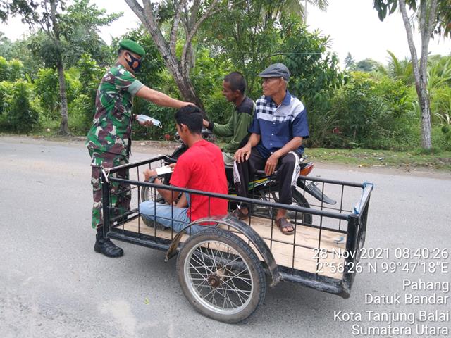 Tanjung Balai | Guna untuk memutus mata rantai penyebaran Virus Covid 19 di wilayah Binaan, supaya warga masyarakat yang berpergian keluar rumah tetap memakai masker dan mengatur jarak selalu menjalankan Protokol Kesehatan maka dengan itu, Personel Bintara Pembina Desa (Babinsa) Koramil 17/Datuk Bandar jajaran Kodim 0208/Asahan Kopda Wirton H Tamba turut serta melaksanakan Gakplin protokol kesehatan untuk menghimbau masyarakat menjaga jarak dan memakai masker mencuci tangan pakai sabun mencegah penyebaran Virus Covid-19 dengan memberikan pemahaman New Normal yaitu menggunakan masker setiap keluar rumah,cuci tangan pakai sabun, menjaga jarak dan membagikan masker, kegiatan tersebut yang dilaksanakan bertempat di Jalan Haji M. Nur Kelurahan Pahang Kecamatan Datuk Bandar Kota Tanjung Balai, Minggu (28/11/2021).