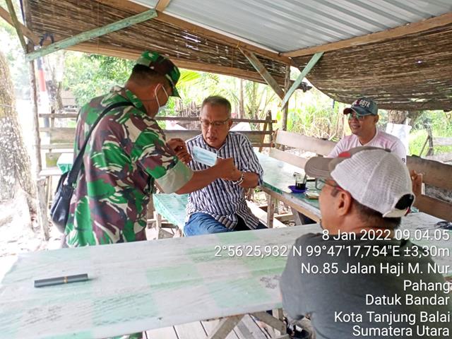 Tanjung Balai | Guna untuk memutus mata rantai penyebaran Virus Covid 19 serta untuk mengugah kesadaran masyarakat terhadap protokol kesehatan dalam rangka memutus rantai penyebaran covid-19 masih harus ditingkatkan dan diingatkan. Hal ini menjadi tugas para aparat di kewilayahan untuk terus melaksanakan sosialisasi dan aksi nyata di lapangan. Guna untuk memutus mata rantai penyebaran Virus Covid-19 di wilayah Binaan, Seperti halnya apa yang dilakukan oleh para Personel Koramil 17/Datuk Bandar jajaran Kodim 0208/Asahan Pelda Syaiful Zuhri turun kejalan raya untuk melaksanakan kegiatan pembagian masker kepada masyarakat dan memberikan himbauan kepada masyarakat tentang protokol kesehatan, yaitu agar selalu menggunakan masker setiap keluar rumah, cuci tangan pakai sabun dan menghindari kerumunan, kegiatan tersebut yang dilaksanakan bertempat di Jalan M.Husni Thamrin Kelurahan Pahang Kecamatan Datuk Bandar Kota Tanjung Balai, Sabtu (08/01/2022).