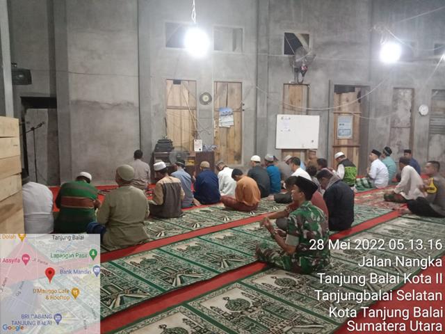 Tanjung Balai | GSSB merupakan program kerja DMI Sumut yang dilaksanakan sebulan 2 kali di setiap kabupaten/kota yang bertujuan agar umat Islam semakin mencintai dan memakmurkan masjid, dalam ha ini Komandan Koramil (Danramil) 09/Tanjung Balai yang diwakilkan oleh Personel Bintara Pembina Desa (Babinsa) Koramil 09/Tanjung Balai jajaran Kodim 0208/Asahan Serka Abdi Ayub Nasution turut serta melaksanakan kegiatan Gerakan Sholat Subuh Berjama’ah (GSBB) Dewan Masjid Indonesia Kota Tanjung Balai, kegiatan tersebut yang dilaksanakan bertempat di Musholla Silaturahim Jalan Nangka Lingkungan ll Kelurahan Tanjung Balai Kota ll Kecamatan Tanjung Balai Selatan Kota Tanjung Balai, Sabtu (28/05/2022).