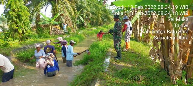Batu Bara | Dalam rangka untuk mengantisipasi banjir pada musim hujan tiba, dalam hal ini seperti yang dilakukan oleh Personel Bintara Pembina Desa (Babinsa) Koramil 04/Talawi jajaran Kodim 0208/Asahan Serma Indra Kurniawan turun kewilayah binaan untuk melaksanakan kegiatan Gotong Royong Pembersihan Irigasi bersama dengan Masyarakat Desa Sei Muka dalam rangka untuk menciptakan dan meningkatkan kerja sama yang baik, dan menjaga silatuhrahmi antara Babinsa dan Masyarakat serta untuk kemanunggalan TNI dan Rakyat, kegiatan tersebut yang dilaksanakan bertempat di Dusun I Desa Sei Muka Kecamatan Datuk Tanah Datar Kabupaten Batu Bara, Minggu (13/02/2022).
