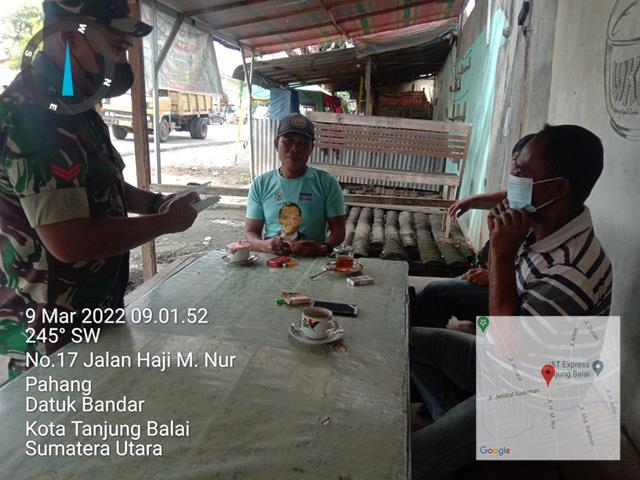 Tanjung Balai | Guna untuk memutus mata rantai penyebaran Virus Covid 19 di wilayah Binaan serta agar terciptanya silahturahmi yang baik antara TNI dengan masyarakat serta guna memutuskan mata rantai penyebaran Virus Covid-19 sebagai bentuk upaya membantu Pemerintah dalam menegakkan disiplin bagi masyarakat sekitarnya, dalam hal ini seperti yang dilakukan oleh Personel Bintara Pembina Desa (Babinsa) Koramil 17/Datuk Bandar jajaran Kodim 0208/Asahan Koptu Ruswandy bersama Pak Lurah dan bhabinkamtibmas dengan pemberian masker dan stiker kepada masyarakat, memberikan pemahaman New Normal yaitu menggunakan masker setiap keluar rumah, cuci tangan pakai sabun, menjaga jarak, menghindari kerumunan dan mengurangi mobilitas, dengan turun kewilayah binaan untuk melaksanakan kegiatan Penegakkan Disiplin Protokol Kesehatan dengan memberikan himbauan untuk mematuhi protokol kesehatan dalam pencegahan penyebaran Corona Virus Desease 2019 (Covid-19), kegiatan tersebut yang dilaksanakan bertempat di Jalan H.M Nur Kelurahan Pahang Kecamatan Datuk Bandar Kota Tanjung Balai, Rabu (09/03/2022).