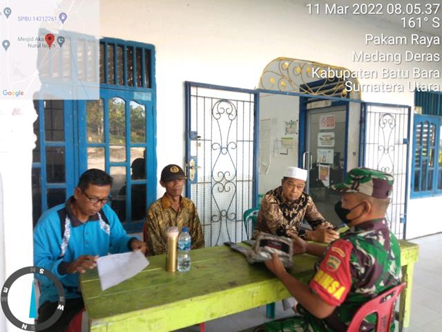 Batu Bara  |  Untuk memelihara dan meningkatkan kebersamaan, Para Babinsa jajaran Kodim 0208/Asahan menggelar komsos dan silaturahmi dengan mitra karib, yang ada di wilayah binaannya masing-masing. Seperti yang dilakukan oleh Personel Bintara Pembina Desa (Babinsa) Koramil 01/Medang Deras jajaran Kodim 0208/Asahan Serda Mahyuddin turun kewilayah desa binaan untuk melaksanakan kegiatan Komunikasi Sosial (Komsos) bersama dengan warga desa binaan diantaranya dalah Bapak Hj Sukron (toga), Bapak Ardian dan Bapak Siswo selaku mitra karib untuk mempererat silaturrahmi di desa binaan dengan warga desa binaan agar semakin akrab dan mengingat kan warga agar tetap memakai masker apabila keluar Rumah, kegiatan tersebut yang dilaksanakan bertempat di Desa Pakam Raya Selatan Kecamatan Medang Deras Kabupaten Batu Bara, Jumat (11/03/2022).