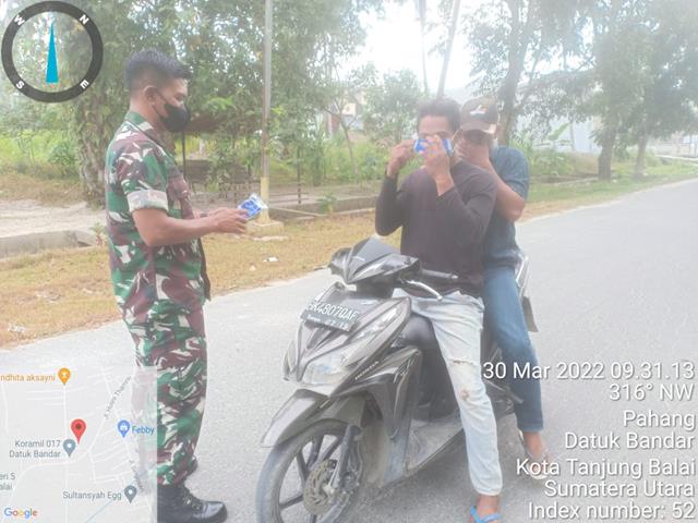 Tanjung Balai | Guna untuk memutus mata rantai penyebaran Virus Covid 19 di wilayah Binaan, dalam hal ini seperti halnya yang dilakukan oleh Personel Bintara Pembina Desa (Babinsa) Koramil 17/Datuk Bandar jajaran Kodim 0208/Asahan Serda F Tanjung turun kewilayah binaan untuk melaksanakan kegiatan pengawasan protokol covid-19 kepada masyarakat dengan memberikan pemahaman New Normal yaitu menggunakan masker setiap keluar rumah, cuci tangan pakai sabun, menjaga jarak dan membagikan masker, kegiatan tersebut yang dilaksanakan bertempat di Jalan H M Nur Kelurahan Gading Kecamatan Datuk Bandar Kota Tanjung Balai, Rabu (30/03/2022).