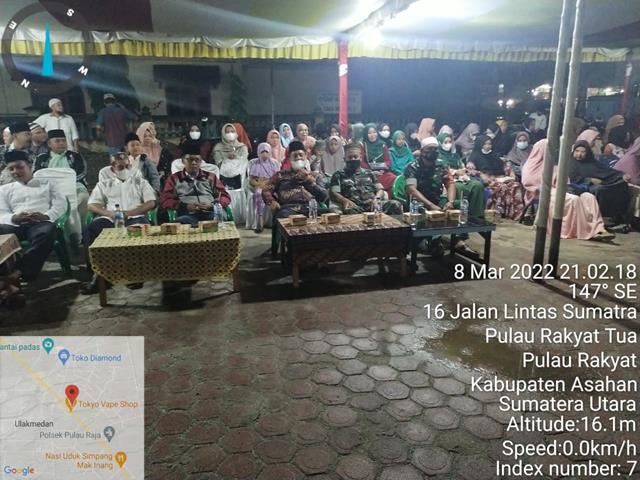 Asahan  |  Tentang peningkatan kualitas nilai taqwa dalam beribadah kepada Allah SWT serta menjadikan Nabi Muhammad SAW sebagai tauladan dalam kehidupan sehari-hari agar selamat dunia akhirat, dalam hal ini seperti yang dilakukan oleh Personel Bintara Pembina Desa (Babinsa) Koramil 16/Pulau Rakayat jajaran Kodim 0208/Asahan Serda Riki Suhada dan 1 orang anggota turun kewilayah binaan untuk melaskanakan kegiatan menghadiri acara Israk’ Mi’kraj Nabi Muhammad SAW 1443 H yang turut serta dihadiri oleh Bapak Alfandi Alhabibi SH (Ustazd), Bapak Hamza (Kepala Desa Pulau Rakyat Tua), Bapak Syahrizal Ardi (BKM), Bapak Kholil (Ulama) dan Masyarakat kurang lebih 130 orang, kegiatan tersebut yang dilaksanakan bertempat di Masjid Al Amin Pulau Rakyat Tua Kecamatan Pulau Rakyat Kabupaten Asahan, Rabu (09/03/2022).