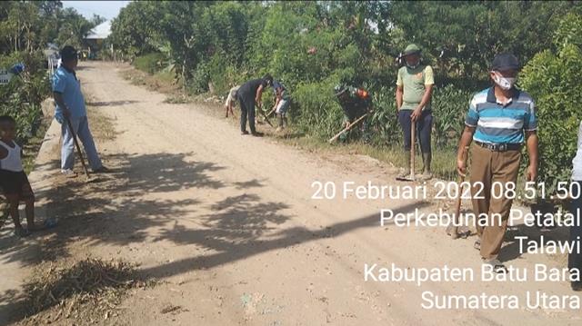 Batu Bara  |  Melestarikan lingkungan hidup di sekitar desan biaan dilakukan oleh Babinsa koramil 04/Talawi, Sertu Nanda Pebru melaksanakan gotong royong bersama masyarakat bertempat di Dusun II, Desa Perkebunan Petatal, Kecamatan Datuk Tanah Datar, Kabupaten Batu Bara, Minggu (20/02/2022).