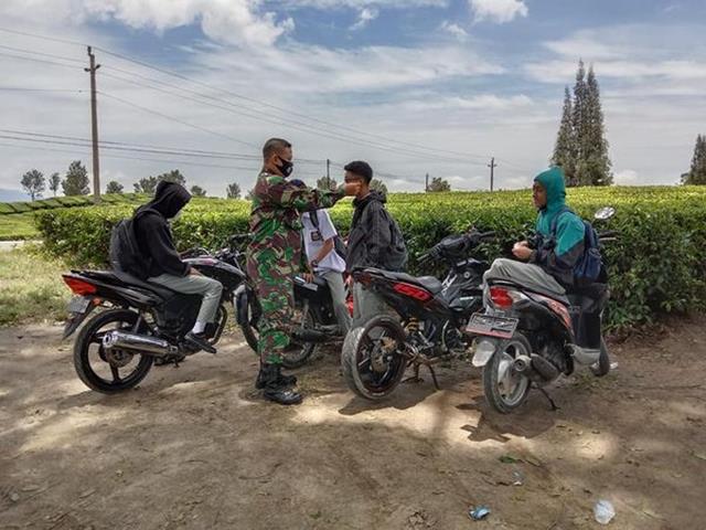 Simalungun | Dalam rangka untuk memutus mata rantai penyebaran Covi-19 diwilayah binaan, dalam hal ini seperti yang dilakukan oleh Personel Bintara Pembina Desa (Babinsa) Koramil 17/Sidamanik jajaran Kodim 0207/Simalungun Kopda Supriadi melaksanakan kegiatan Penegakan disiplin protokol Kesehatan ditempat wisata, kegiatan terebut yang dilaksanakan bertempat di Simpang Bah Butong Perkebunan Teh Sidamanik Kabupaten Simalungun, Jumat (29/04/2022).