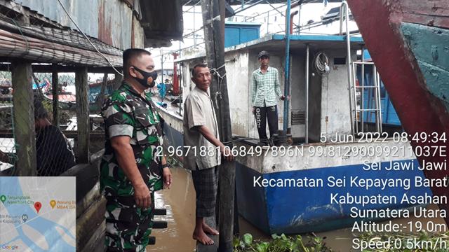 Asahan | Upaya membangun Komunikasi Sosial dengan seluruh masyarakat terus dilakukan Babinsa, untuk mewujudkan kemanunggalan TNI dan Rakyat. Seperti dilakukan oleh Personel Bintara Pembina Desa (Babinsa) Koramil 10/Sei Kepayang jajaran Kodim 0208/Asahan Serda Yuspa K turun kewilayah binaan untuk melaksanakan kegiatan Komunikasi Sosial (Komsos) bersama dengan Nelayan Desa Sei Jawi Jawi Kecamatan Sei Kepayang Barat dalam rangka untuk menghimbau warga masyarakat Desa Jawi Jawi yang Nelayan agar mematuhi dan melaksanakan Protokol Kesehatan, agar terjalinnya Komunikasi yang baik dan mempererat persaudaraan antara Babinsa Koramil 10/SK dengan warga Desa Jawi Jawi, kegiatan tersebut yang dilaksanakan bertempat di Tangkahan Bot Nelayan Desa Sei Jawi Jawi Kecamatan Sei Kepayang Barat Kabupaten Asahan, Minggu (05/06/2022).