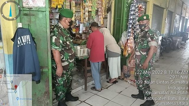 Batu Bara | Para pedagang dan pembeli merasa senang dengan adanya himbauan dari Babinsa, agar masyarakat selalu mengikuti Protokoler Kesehatan yg telah ditetapkan oleh Pemerintah guna mencegah penyebaran Virus Covid-19, menyikapi hal tersebut Personel Bintara Pembina Desa (Babinsa) Koramil 02/Air Putih jajaran Kodim 0208/Asahan Serda Hendra S dan Koptu Irpan Sinaga turun kewilayah binaan ditempat keramaian dengan melaksanakan Pengamanan Disiplin Mandiri Covid-19 di Pasar Delima Indrapura dengan menghimbau para pengunjung dan pedagang selalu mengunakan masker dan mencuci tangan serta jaga jarak antar pengunjung,agar terhindar dari penyebaran penularan Covid-19, kegiatan yang dilaksanakan tersebut bertempat di Pasar Delima Indrapura Kelurahan Indrapura Kecamatan Air Putih Kabupaten Batu Bara, Minggu (22/05/2022).
