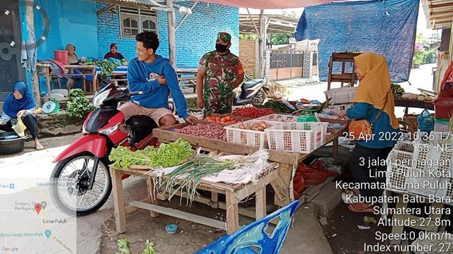 Batu Bara  |  Guna untuk memutus mata rantai penyebaran Virus Covid 19 di wilayah Binaan. Dalam hal ini Personel Bintara Pembina Desa (Babinsa) Koramil 03/Lima Puluh jajaran Kodim 0208/Asahan Serda Sutikno turun kewilayah desa binaan dengan melaksanakan Komunikasi Sosial (Komsos) dalam rangka untuk memeberikan himbauan kepada warga binaan tentang pentingnya mematuhi Disiplin Protokol Kesehatan serta pentingnya memakai Masker untuk menghindari penyebaran Covid-19  sekaligus memberikan himbauan kepada Pedagang  agar selalu mematuhi anjuran Pemerintah yaitu mematuhi Protokol Kesehatan guna mempercepat dan memutus mata rantai penyebaran pandemi Virus Corona, sama dengan Bapak Kepling IV Bapak Misdi dan Masyarakat/Pedagang lingkungan IV Lima Puluh Kota, kegiatan tersebut yang dilaksanakan bertempat di Lingkungan IV Kelurahan Lima Puluh Kota Kecamatan Lima Puluh Kabupaten Batu Bara, Senin (25/04/2022).