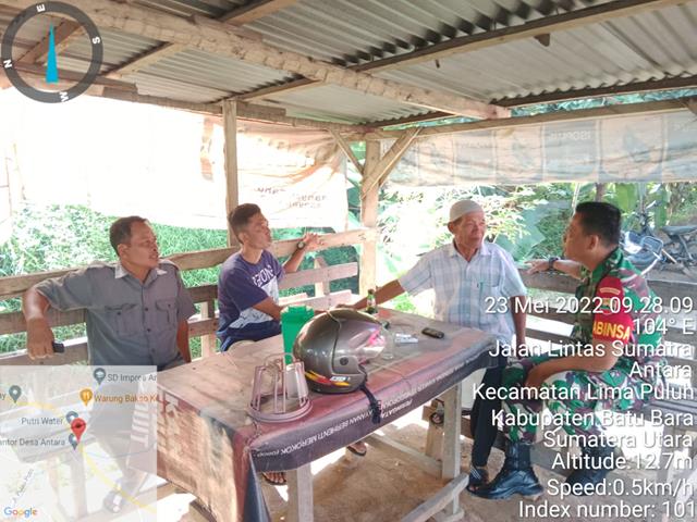 Batu Bara | PMK pada ternak tidak bersifat zoonosis, artinya tidak dapat menular atau menginfeksi manusia, karenanya masyarakat tidak perlu panik dan khawatir dalam mengonsumsi daging dan susu, asal diolah atau dimasak dengan benar, maka aman, dalam hal ini seperti yang dilakukan oleh Personel Bintara Pembina Desa (Babinsa) Koramil 03/Lima Puluh jajaran Kodim 0208/Asahan Serka Agus Supriadi turun kewilayah binaan untuk melaksanakan kegiatan Komunikasi Sosial (Komsos) bersama dengan Kepala Dusun 1 dan warga Desa Antara memberikan arahan tentang kewaspadaan dini terhadap warga yang mempunyai hewan ternak, agar warga selalu waspada dan lebih berhati-hati agar selalu meningkatkan keamanan di lingkungan Desa Antara dengan cara meningkatkan Ronda/jaga malam secara bergiliran dan bergantaian agar keamanan tetap terjaga, bersama dengan Kepala Dusun 1 Bapak Iwan dan Warga Desa Antara, kegiatan tersebut yang dilaksanakan bertempat di Desa Antara Kecamatan Limapuluh Kabupaten Batu Bara, Senin (23/05/2022).