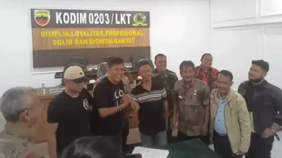 Binjai – Dandim 0203/Langkat Letkol Inf M Eko Prasetyo Bersama Forkopimda Binjai  dan Ormas IPK dan PP menggelar  rapat /Medisi untuk mencari solusi di Aula Kodim 0203/Langkat.Kamis (22/6/2023)