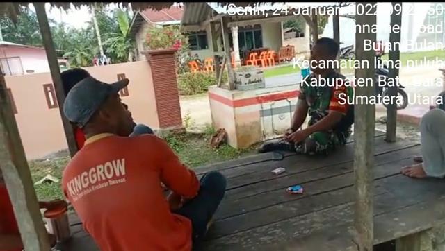 Batu Bara | Dalam rangka untuk menciptakan kerja sama dan menjaga hubungan silaturahmi yang baik antara Babinsa dengan Masyarakat desa serta untuk meningkatkan kepedulian masyarakat desa guna mendukung tugas Pokok Babinsa, dalam hal ini Personel Bintara Pembina Desa (Babinsa) Koramil 03/Lima Puluh jajaran Kodim 0208/Asahan Serda Edi Rianto turun kewilayah binaan untuk melaksanakan kegiatan Komunikasi Sosial (Komsos) bersama dengan Kadus dalam rangka untuk menjalin hubungan yang lebih akur dan harmonis dalam rangka melaksanakan tugas di kewilayah bersama dengan Kadus II Bapak Sri Dewadi dan Masyarakat Desa Bulan Bulan, kegiatan tersebut yang dilaksanakan bertempat di Desa Bulan-Bulan Kecamatan Lima Puluh Pesisir Kabupaten Batu Bara, Senin (24/01/2022).