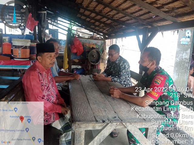 Batu Bara | Supaya terjalin komunikasi yang baik antara Babinsa dengan masyarakat, pada kesempatan tersebut selaku Personel Bintara Pembina Desa (Babinsa) Koramil 03/Lima Puluh jajaran Kodim 0208/Asahan Serka IG. Sitorus turut serta melaksanakan kegiatan Komunikasi Sosial (Komsos) bersama dengan tomas dan warga desa Simpang Gambus dalam rangka membahas siskamling dan kamtibmas agar wilayah Aman dan Kondusif sehingga masyarakat bebas beraktivitas sesuai bidangnya masing2 dalam rangka untuk mensosialisasikan arti Vaksin Booster Covid-19 kepada warga Masyarakat diwilayah binaan bersama dengan Tomas (Bapak Ismail) dan Warga Desa Simpang Gambus, kegiatan tersebut yang dilaksanakan bertempat di Dusun V Desa Simpang Gambus Kecamatan Lima Puluh Kabupaten Batu Bara, Sabtu (23/04/2022).