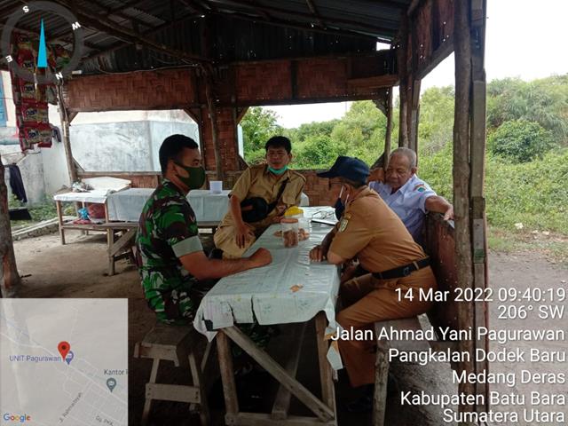 Batu Bara | Dalam rangka agar terjalinnya komunikasi yang baik dan Harmonis antara Babinsa dengan masyarakat Desa binaan dalam rangka guna mempererat tali silaturahmi dan kerja sama yang baik serta terjalinnya hubungan silaturahmi dengan masyarakat dan warga binaan, dalam hal ini seperti yang dilakukan oleh Personel Bintara Pembina Desa (Babinsa) Koramil 01/Medang Deras jajaran Kodim 0208/Asahan Serda Supris turun kewilayah binaan dengan cara melaksanakan Komunikasi Sosial (Komsos) dengan warga binaan sebagai mitra karib guna menjalin hubungan silaturahmi yang baik dan mengingatkan kembali agar menggunakan masker jika keluar rumah bersama dengan Bapak Supardi dan Ibu Dewi, kegiatan tersebut yang dilaksanakan bertempat di Desa Pematang Cengkring Kecamatan Medang Deras Kabupaten Batu Bara, Senin (14/03/2022).