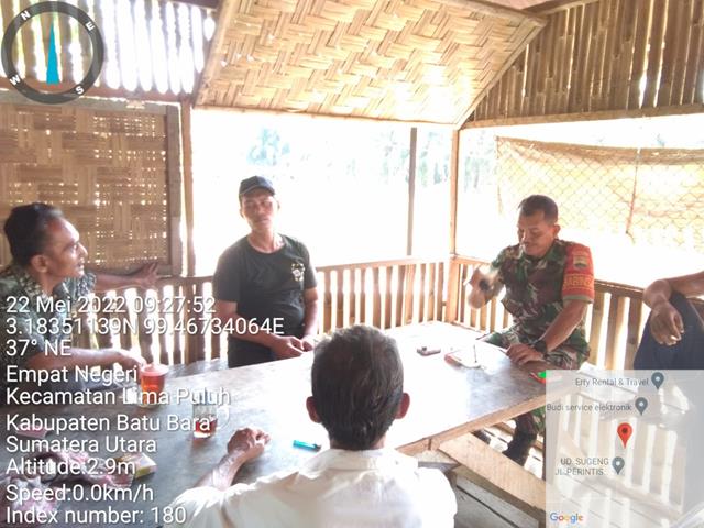 Batu Bara  |  Komsos sebagai sarana babinsa untuk bersilaturahmi dengan tokoh-tokoh yang ada di masyarakat Desa binaannya, seperti yang dilakukan oleh Personel Bintara Pembina Desa (Babinsa) Koramil 03/Lima Puluh jajaran Kodim 0208/Asahan Serka Mulyadi turun kewilayah binaan untuk melaksanakan kegiatan Komunikasi Sosial (Komsos) bersama dengan Kepala Dusun 1, Ketua Kelompok Tani dan masyarakat desa, merencanakan gagasan dari masyarakat untuk melaksanakan perbaikan dan pengerasan jalan pertanian dengan menggunakan anggaran dari Dana Desa ataupun dengan gotong- royong, sehingga untuk lalu lintas membawa pupuk dan hasil tani agar berjalan lancar, bersama dengan Kepala Dusun 1 Bapak Helfiadi, Ketua Kelompok Tani Bapak Ponirin dan Warga masyrakat Empat Negeri, kegiatan tersebut yang dilaksanakan bertempat di Dusun 1 Desa Empat Negeri Kecamatan Lima Puluh Kabupaten Batu Bara, Minggu (22/05/2022).