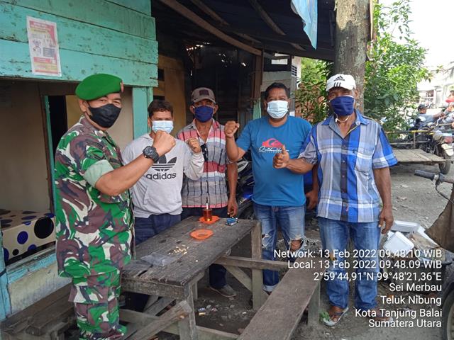 Tanjung Balai  |  Untuk mewujudkan kemanunggalan TNI dan Rakyat, upaya membangun Komunikasi Sosial (Komsos) dengan warga wilayah binaan terus dilakukan Babinsa, dalam hal ini seperti yang dilakukan oleh Personel Bintara Pembina Desa (Babinsa) Koramil 08/Pulau Buaya jajaran Kodim 0208/Asahan Sertu Agustiar turun kewilayah binaan untuk melaksanakan kegiatan Komunikasi Sosial (Komsos) bersama dengan Nelayan dan pekerja SPTI, Babinsa menghimbau agar selalu memperhatikan keselamatan dalam  bekerja, juga para pekerja menjaga Kesehatan dengan selalu memakai Masker agar terhindar dari  Penyebaran Covid 19 bersama dengan Bapak Ramli Manik, Bapak Herman, Bapak Suheri dan Bapak Rudiansyah, kegiatan tersebut yang dilaksanakan bertempat di Lingkungan V Kelurahan Sei Merbau Kecamatan Teluk Nibung Kota Tanjung Balai, Minggu (13/02/2022).