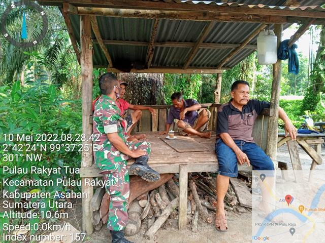 Asahan  |  Dalam rangka untuk menciptakan kerja sama dan menjaga hubungan silaturahmi yang baik antara Babinsa dengan Masyarakat desa serta untuk meningkatkan kepedulian masyarakat desa guna mendukung tugas Pokok Babinsa, dalam hal ini Personel Bintara Pembina Desa (Babinsa) Koramil 16/Pulau Rakayat jajaran Kodim 0208/Asahan Serka Sudarmono dan 1 orang anggota Babinsa turun kewilayah binaan untuk melaksanakan kegiatan Komunikasi Sosial (Komsos) bersama dengan warga masyarakat selaku Mitra Karib agar dapat mengetahui tentang permasalahan dan kondisi sosial di tengah masyarakat  dan meningkatkan hubungan yang Harmonis antara Babinsa dengan masyarakat binaan dalam rangka untuk menjalin hubungan yang lebih akur dan harmonis dalam rangka melaksanakan tugas di kewilayah serta himbauan agar selalu mematuhi Prokes kepada Masyarakat bersama dengan Bapak Asnan, Bapak Suyatno dan Bapak M. Purba, kegiatan tersebut yang dilaksanakan bertempat di jalinsum Dusun 1 Desa Pulau Rakyat Tua Kecamatan Pulau Rakyat Kabupaten Asahan, Selasa (10/05/2022).