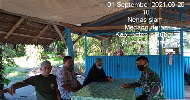 Batu Bara | Dalam rangka menjalin kerjasama dalam membina keharmonisan, personil Koramil 01/Medang Deras jajaran Kodim 0208/Asahan Serda Saketang turut serta melaksanakan kegiatan Komunikasi Sosial (Komsos) bersama dengan masyarakat warga binaan guna menjalin dan mempererat hubungan silaturahmi yg baik dan menghimbau agar tetap mematuhi protokol kesehatan bersama dengan Bapak Zulkifli, Bapak Zainuddin dan Bapak Ilham Arief, agar terhindar dari virus Covid-19, kegiatan tersebut yang dilaksanakan bertempat di Desa Nenassiam Kecamatan Medang Deras Kabupaten Batu Bara, Rabu (01/09/2021).