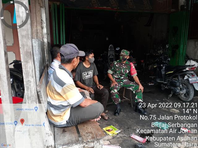 Asahan | Supaya terjalin komunikasi yang baik antara Babinsa dengan masyarakat, dalam hal ini seperti yang dilakukan oleh Personel Bintara Pembina Desa (Babinsa) Koramil 07/Air Joman jajaran Kodim 0208/Asahan Serma Herdyansjah turun kewilayah binaan untuk turut serta melaksanakan kegiatan Komunikasi Sosial (Komsos) bersama dengan masyarakat di desa binaan yang bekerja sebagai montir dan pengguna jasa atau konsumen bengkel Sepeda Motor dalam rangka komsos membicarakan tentang kebersihan lingkungan diantaranya tempat menjalankan usaha agar dijaga kebersihannya dengan membudayakan hidup bersih dan sehat bersama dengan Bapak Pujianto (Tokoh Masyarakat), Bapak Misno (Konsumen) dan Bapak Tugiran (Pemilik Bengkel) dengan menghimbau untuk selalu mematuhi Prokes agar terhindar dari Covid-19, kegiatan tersebut yang dilaksanakan bertempat di Lingkungan-VII Kelurahan Binjai Serbangan Kecamatan Air Joman Kabupaten Asahan, Sabtu (23/04/2022).