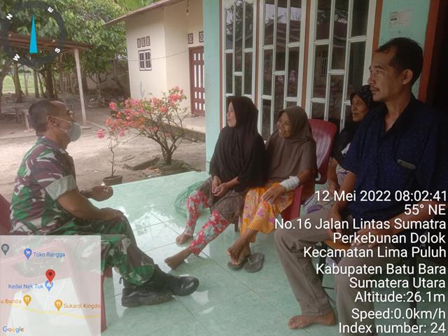 Batu Bara | Guna membina silaturahmi yang baik dengan warga Masyarakat desa binaan, dalam hal ini seperti yang dilakukan oleh Personel Binatar Pembina Desa (Babins) Koramil 03/Lima Puluh jajaran Kodim 0208/Asahan Serka Agus Fajar tak henti bersinergi dengan melaksanakan kegiatan Komunikasi Sosial (Komsos) bersama Warga masyarakat desa sumber padi membrikan arahan kepada ibu2 warga desa sumber padi agar selalu menjaga dan meningkatkan kebersihan rumah dan pekaranganya di mana saat ini musim penghujan dan tidak membuang sampah sembarang tempat karena kelmbapan tanah dan udarah dapat mengakibatkan bau busuk serta pencemaran udarah hal ini berdampak timbulnya bibit penyakit jadi dgn selalu menjaga kebersihan warga akan tetap sehat serta menghimbau agar selalu menggunakan masker bila keluar rumah serta tetap menjaga prokes serta melaksanakan komsos dengan warga masyarakat Desa Sumber Padi guna menjaga silaturahmi yang baik serta mengajak masyarakat untuk selalu menjaga kebersihan dan keamanan di wilayah kita, kegiatan tersebut yang dilaksanakan bertempat di Desa Sumber Padi Kecamatan Lima Puluh Kabupaten Batu Bara, Kamis (12/05/2022).