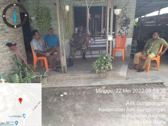 Asahan | Agar Masyarakat selalu menjaga kesehatan guna memutus penyebaran mata rantai Virus Corona (Covid-19) serta agar terjalin silaturahmi yang baik anatara Babinsa dan masyarakat, kegiatan Personel Bintara Pembina Desa (Babinsa) Koramil 15/Bandar Pulau jajaran Kodim 0208/Asahan Serda Tumirin Purnomo turun kewilayah desa binaan untuk melaksanakan Sosialisasi dan Komunikasi Sosial (Komsos) kepada warga Desa Binaan di rumah Bapak Ponirun Kadus V desa Marjanji Aceh dalam rangka Adapun tujuan kegiatan ini sebagai sarana membina silaturahmi dan memantapan kemanunggalan TNI dengan Rakyat, bersama dengan Bapak Ponirun Kkadus V, Bapak Rahmat Kadus Vl dan Bapak Piktor Panjaitan Kadus l, kegiatan tersebut yang dilaksanakan bertempat di Dusun V Desa Marjanji Aceh Kecamatan Aek Songsongan Kabupaten Asahan, Minggu (22/05/2022).