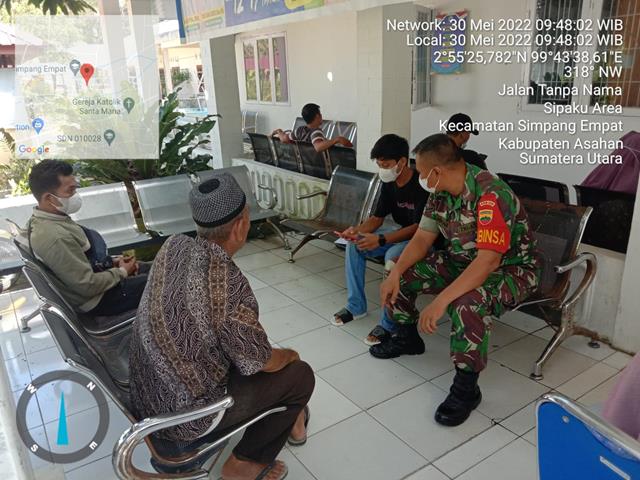 Asahan | Dalam rangka agar terjalinnya Komunikasi dan mempererat tali silaturrahmi dengan masyarakat guna menciptakan suasana yang Harmonis, aman dan tentram di Wilayah Binaan Babinsa serta untuk meningkatkan sinergitas di wilayah binaanya, seperti halnya yang dilakukan oleh Personel Bintara Pembina Desa (Babinsa) Koramil 11/Simpang Empat jajaran Kodim 0208/Asahan Serda Rahman turun kewilayah binaan untuk melaksanakan kegiatan Komunikasi Sosial (Komsos) bersama dengan warga Masyarakat binaan dalam rangka untuk menjalin silaturahmi dengan masyarakat bersama dengan Bapak Syamudi, Bapak Poniman, Bapak Ilham Riski dan Ibu Renasah, kegiatan tersebut yang dilaksanakan bertempat di Puskesmas Simpang Empat Kecamatan SImapang Empat Kabupaten Asahan, Senin (30/05/2022).