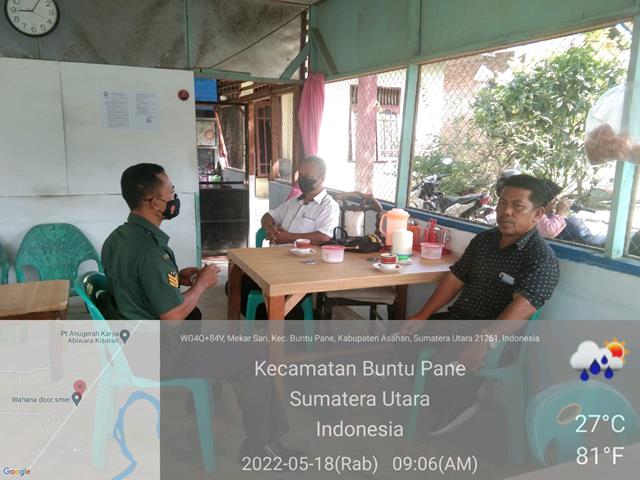Asahan | Guna meningkatkan hubungan kerja yang baik di wilayahnya, menyikapi hal tersebut seperti yang dilakukan oleh Personel Bintar Pembina Desa (Babinsa) Koramil 13/Buntu Pane jajaran Kodim 0208/Asahan Serka Susastra bersama Tokoh Masyarakat turun kewilayah binaan untuk turut serta melaksanakan kegiatan Komunikasi Sosial (Komsos) bersama dengan Tokoh Masyarakat Bapak Jul Amri dan Bapak Supranoto dalam rangka untuk menjalin hubungan tali Silahturahmi yang baik dan Keharmonisan dalam menunjang tugas pokok selaku Babinsa diwilayah Desa binaan serta membahas tentang situasi keamanan dan kebersihan di wilayah desa binaan, kegiatan tersebut yang dilaksanakan bertempat di Dusun 6 Desa Mekar Sari Kecamatan Buntu Pane Kabupaten Asahan, Rabu (18/05/2022).