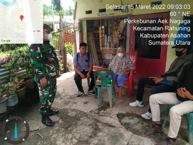 Dalam hal ini seperti yang dilakukan oleh Personel Bintara Pembina Desa (Babinsa) Koramil 15/Bandar Pulau jajaran Kodim 0208/Asahan Serda Zulkifli Hutapea turun kewilayah binaan untuk melaksanakan kegiatan Komunikasi Sosial (Komsos) bersama dengan warga desa binaan di salah satu warga di rumah ibu Suliyah Siregar dalam rangka membahas tentang masalah mayarakat yang sudah tervaksin bersama dengan Bapak Poniman (Kadus), Bapak Sulaiman (Ketua Pemuda) dan Ibu Suliyah (Warga), kegiatan tersebut yang dilaksanakan bertempat di Dusun 3 Desa Perkebunan Aek Nagaga Kecamatan Rahuning Kabupaten Asahan, Selasa (15/03/2022).