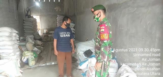 Asahan | Memakai masker mulut dapat menjadi salah satu cara terbaik agar kita tidak mudah tertular atau menularkan penyakit. Masker yang digunakan dengan benar bisa membantu mencegah virus dan bakteri menyebar melalui lendir atau cairan yang keluar saat kamu bersin atau batuk, dalam hal ini Personel Bintara Pembina Desa (Babinsa) Koramil-07/Air Joman jajaran Kodim 0208/Asahan Serda Ali Imron turun kewilayah binaan untuk melaksanakan kegiatan Komunikasi Sosial (Komsos) bersama dengan warga binaannya yang berprofesi sebagai pedagang bahan pertanian (Pupuk, dsb) dalam rangka menghimbau agar memakai Masker disetiap bekerja, kegiatan tersebut yang dilaksanakan bertempat di Desa Air Joman Kecamatan Air Joman Kabupaten Asahan, Jumat (27/08/2021).