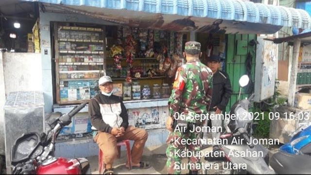Asahan | Menciptakan kerja sama,dan menjaga silatuhrahmi yang baik antara Babinsa dengan Aparat Kelurahan terkait dan Meningkatkan Kinerja antara TNI – Aparat Kelurahan guna mendukung tugas pokok Babinsa serta dalam rangka pencegahan penyebaran Wabah Virus Corona (Covid-19), Personel Bintara Pembina Desa (Babinsa) Koramil 07/Air Joman jajaran Kodim 0208/Asahan Serka Joni Iwan Priono turun langsung kewilayah desa binaan untuk melaksanakan kegiatan Komunikasi Sosial (Komsos) bersama dengan warga binaannya yaitu tokoh masyarakat desa Air Joman Bapak Hariadi (Tomas) dan Bapak Rahmat (Warga), dengan tujuan meningkatkan kerjasama dan silaturrahim serta membahas tentang perkembangan situasi saat ini khususnya tentang Kamtibmas dan sosial kemasyarakatan khususnya, kegiatan tersebut yang dilaksanakan bertempat di wilayah Dusun-III Desa Air Joman Kecamatan Air Joman Kabupaten Asahan, Senin (06/09/2021).