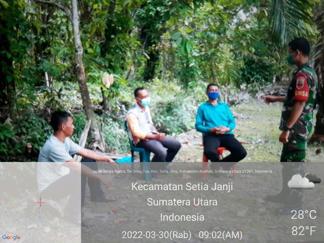 Asahan | Dalam rangka untuk menjalin silaturahmi dengan warga binaan, dalam hal ini seperti yang dilakukan oleh Personel bintara Pembina Desa (Babinsa) Koramil 13/Buntu Pane jajaran Kodim 0208/Asahan Praka Febriyanto turun kewilayah binaan untuk melaksanakan kegiatan komunikasi Sosial (Komsos) di Masyarakat binaan selaku Tokoh Masyarakat dan mitra karib serta warga masyarakat binaan dengan menghimbau agar warga selalu mendisiplinkan diri dalam menjaga kesehatan sehari hari, kegiatan ini dilaksanakan bersama dengan Tokoh Masyarakat Bapak Kusno, Mitra karib Bapak Badrul dan Mitra karib Bapak Sawal, kegiatan tersebut yang dilaksanakan bertempat di wilayah binaan Dusun 3 Desa Sei Silau Tua Kecamatan Setia Janji Kabupaten Asahan, Rabu (30/03/2022).
