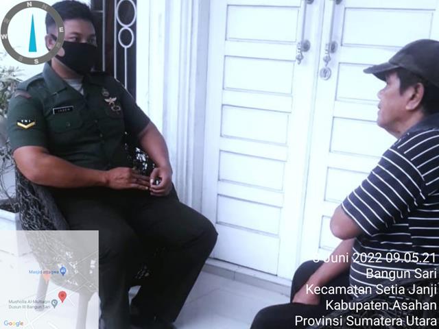 Asahan | Seluruh Babinsa diwilayah binaannya selalu memberikan himbauan kepada warganya agar Selalu menjaga jarak, selalu cuci tangan dengan sabun dan bilas di air yang mengalir, menghindari keramaian dan usahakan pakai masker bila keluar dari rumah atau bepergian, seperti halnya yang dilakukan Personel Bintara Pembina Desa (Babinsa) Koramil 13/Buntu Pane jajaran Kodim 0208/Asahan Serda Jasem turun kewilayah binaan untuk melaksanakan kegiatan silaturahmi kerumah tokoh masyarakat a.n. Bapak Sofyan untuk dalam rangka untuk menjalin hubungan yang lebih akrab dengan masyarakat guna mendukung kegiatan babinsa, kegiatan tersebut yang dilaksanakan bertempat di Dusun 4 Desa Bangun Sari Kecamatan Setia Janji Kabupaten Asahan, Rabu (08/06/2022).