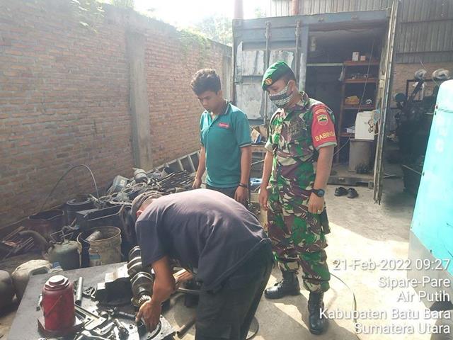 Batu Bara | Untuk menciptakan dan meningkatkan kerja sama yang baik dan menjaga silatuhrahmi antara TNI dengan masyarakat desa serta untuk menciptakan kemanunggalan TNI dan Rakyat, dalam rangka untuk menumbuh kembangkan sikap kebersamaan sehingga dengan kegiatan ini terjalin hubungan yang harmonis antara Babinsa dengan masyarakat. Seperti yang dilakukan oleh Personel Bintara Pembina Desa (Babisna) Koramil 02/Air Putih jajaran Kodim 0208/Asahan Serda Albin Silaban turun kewilayah binaan untuk turut serta melaksanakan kegiatan Komunikasi Sosial (Komsos) bersama dengan Tokoh Masyarakat Bapak Angga dan Masyakat Desa Binaan selaku Karyawan Bengekl Sepeda Motor tersebut Bapak Jonatan sekaligus Pembagian Masker serta memberikan himbauan dan mengajak Masyarakat agar selalu menggunakan Masker dan mematuhi Protokol Kesehatan dan bersilaturahmi sekaligus menghimbau agar tetap selalu menjaga kesehatan serta keselamatan, menjaga faktor keamanan dalam menjalankan kegiatan sehari-hari, hingga merasa aman dan nyaman, kegiatan tersebut yang dilaksanakan bertempat di bengkel milik Bapak Lubis Dusun III Desa Sipare Pare Kecamatan Air Putih Kabupaten Batu Bara, Senin (21/02/2022).