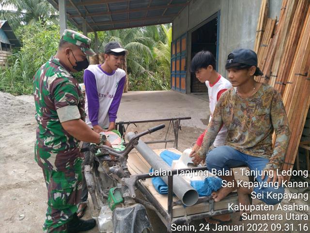 Tanjung Balai | Agar terjalin kerjasama dan Tali Silahturami antar Babinsa dengan sesama Masyarakat serta dalam membangun sinergitas baik antara TNI khususnya Babinsa dengan masyarakat dan menjalin silahturahmi dengan masyarakat guna mendukung tugas Babinsa, Seperti yang dilakukan Personel Bintara Pembina Desa Koramil 10/Sei Kepayang jajaran Kodim 0208/Asahan Serda Halimat turun kewilayah binaan untuk melaksanakan kegiatan Komunikasi Sosial (Komsos) dengan masyarakat wilayah binaan dalam rangka agar terjalinnya hubungan yang harmonis dan Komunikasi yang baik Babinsa Koramil 10/ SK dengan masyarakat Desa Sei Kepayang Kanan, kegiatan tersebut yang dilaksanakan yang bertempat di Dusun 2 Desa Sei Kepayang Kanan Kecamatan Sei Kepayang Kabupaten Asahan, Senin (24/01/2022).