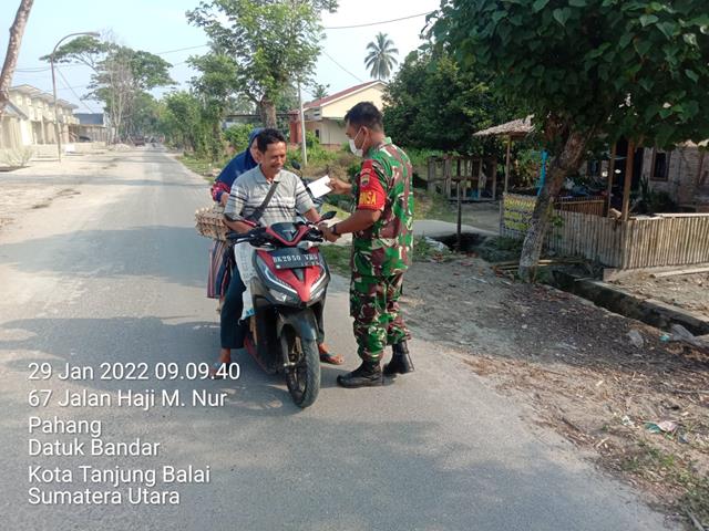 Tanjung Balai  |  Guna untuk memutus mata rantai penyebaran Virus Covid 19 di wilayah Binaan serta agar terjalinnya hubungan yang Harmonis antara Masyarakat Desa Binaan dengan Babinsa, seperti yang dilakukan oleh Personel Bintara Pembina Desa (Babinsa) Koramil 17/Datuk Bandar jajaran Kodim 0208/Asahan Koptu Ruswandy turun kewilayah binaan untuk melaksanakan kegiatan Komunikasi Sosial (Komsos) bersama dengan warga Desa Binaan serta melaksanakan pengawasan protokol Covid-19 kepada masyarakat dengan memberikan pemahaman New Normal yaitu menggunakan masker setiap keluar rumah,cuci tangan pakai sabun,  menjaga jarak dan membagikan masker, kegiatan tersebut yang dilaksanakan berlokasi tepatnya di Jalan  H.M. Nur Kelurahan Pahang Kecamatan Datuk Bandar Kota Tanjung Balai, Sabtu (29/01/2022).