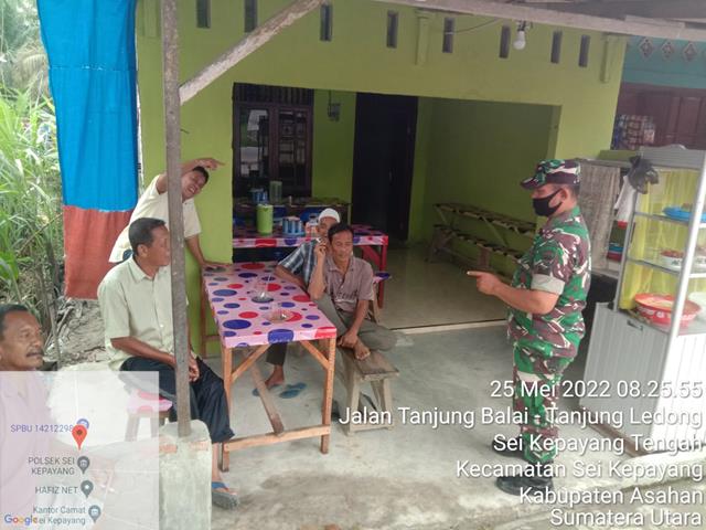 Asahan | Dalam rangka supaya terjalinnya hubungan yang baik dan Harmonis antara warga masyarakat Binaan dengan Babinsa Koramil 10/SK, agar terciptanya Kemanunggalan TNI dan Rakyat serta terjalinya hubungan baik antara Babinsa dan Aparatur Desa menunjang Tupoksi Apter, dalam hal ini Personel Bintara Pembina Desa (Babinsa) Koramil 10/Sei Kepayang jajaran Kodim 0208/Asahan Serma SJ Daulay turun kewilayah binaan untuk melaksanakan kegiatan Komunikasi Sosial (Komsos) bersama dengan warga masyarakat Desa Sei Kepayang Tengah dalam rangka menyampaikan agar Pemuda membuat kegiatan yang bermanfaat bagi masyarakat contohnya dengan bergotong royong dan berkarya serta yang paling utama jahui narkoba. Agar tercipta keamanan dan kenyamanan di lingkungannya, kegiatan tersebut yang dilaksanakan bertempat di Kedai Nasi Pak Syahrial Dusun 2 Desa Sei Kepayang Tengah Kecamatan Sei Kepayang Kabupaten Asahan, Rabu (25/05/2022).
