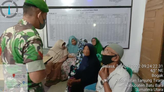 Ashaan | Agar masyarakat,dan TNI dapat berbaur,serta terjalin nya kerja sama yang baik antara TNI-masyarakat, dalam hal ini seperti yang dilakukan oleh Personel Bintara Pembina Desa (Babinsa) Koramil 05/Tanjung Tiram jajaran Kodim 0208/Asahan Kopda Dedi Irawan turun kewilayah binaan untuk melaksanakan kegiatan Penggalangan Mitra Karib dan warga menjalin komunikasi dan kerja sama yang baik dan mengingatkan agar tetap mamakai masker apabila keluar rumah dan tetap mematuhi Prokes dengan cara Komunikasi Sosial diwilayah binaan bersama Bapak Bahri, Bapak Andi, Ibu Saminah, Ibu Yusniar, Ibu Rina dan Ibu Masyitah dalam rangka menghimbau agar tetap menghimbau masyarakat agar mematuhi protokol kesehatan jaga jarak pakai masker dan cuci tangan agar terhindar dari penularan Covid-19, kegiatan tersebut yang dilaksanakan bertempat di Desa Pahlawan Kecamatan Tanjung Tiram Kabupaten Batu Bara, Selasa (26/04/2022).