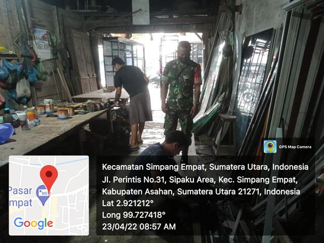 Asahan | Agar terjalinnya komunikasi yang baik dengan warga masyarakat binaan, dalam hal ini seperti yang dilakukan oleh Personel Bintara Pembina Desa (Babinsa) Koramil 11/Simapng Empat jajaran Kodim 0208/Asahan Sertu Nelson Lumbantoruan turun kewilayah binaan untuk melaksanakan kegiatan Komunikasi Sosial (Komsos) bersama dengan warga Desa binaan bersama Bapak Sutrisno pengrajin lemari kaca dalam rangka sosialisasi pendisiplinan protokol kesehatan guna mengurangi penyebaran Covid-19, kegiatan tersebut yang dilaksanakan bertempat di Jalan Perintis Kemerdekaan Desa Simpang Empat Kecamatan Simpang Empat Kabupaten Asahan, Sabtu (23/04/2022).